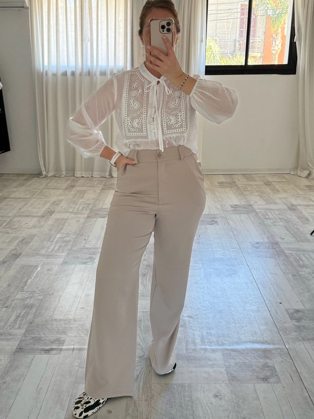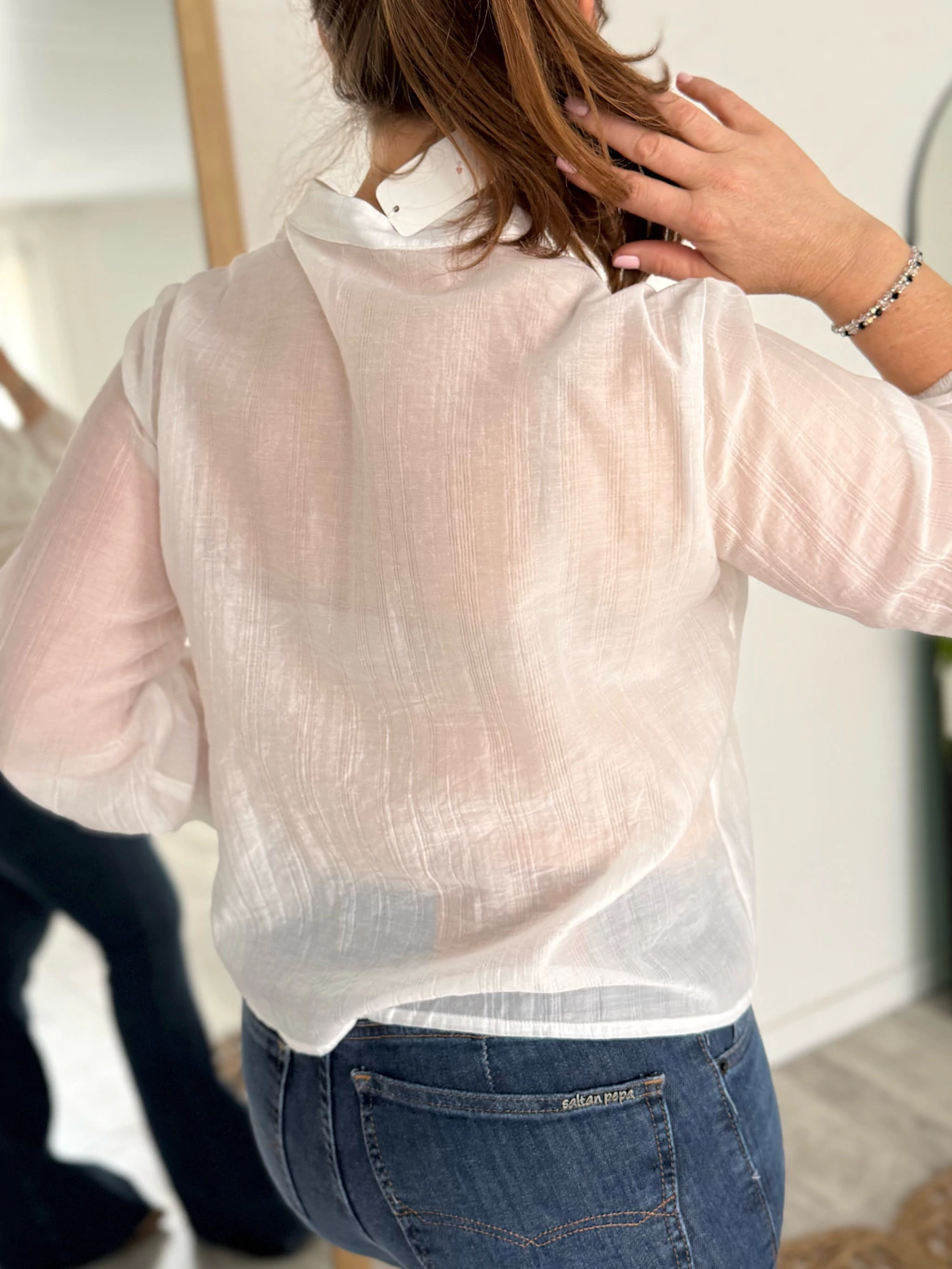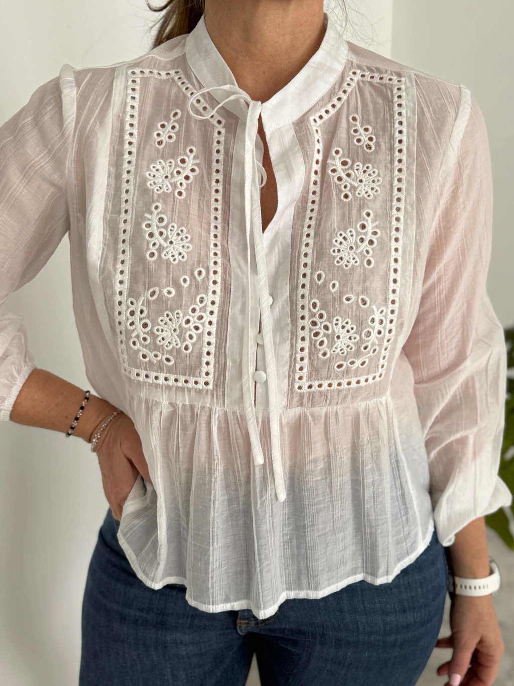 ¡Un toque de ensueño para tu guardarropas! La Blusa Analia es sinónimo de delicadeza. Su diseño combina la transparencia sutil con un bordado artesanal exquisito en el pecho, creando una prenda etérea e inolvidable. El escote con lazo y el bordado broderie aportan textura y romanticismo, ideal para usar con jeans para un look casual elevado o con faldas de cuero para un contraste atrevido. Confeccionada en un tejido vaporoso, es perfecta para los días más cálidos.