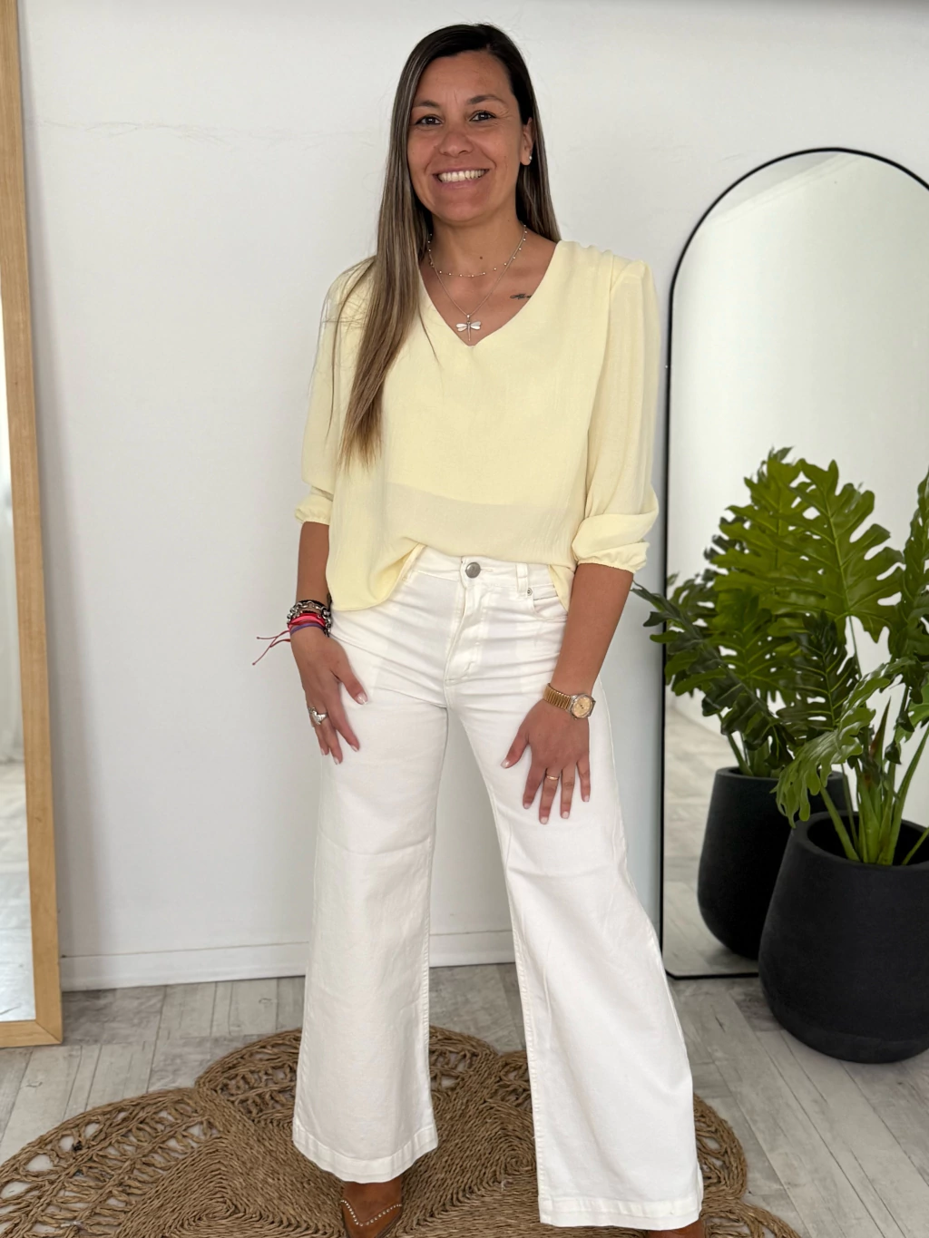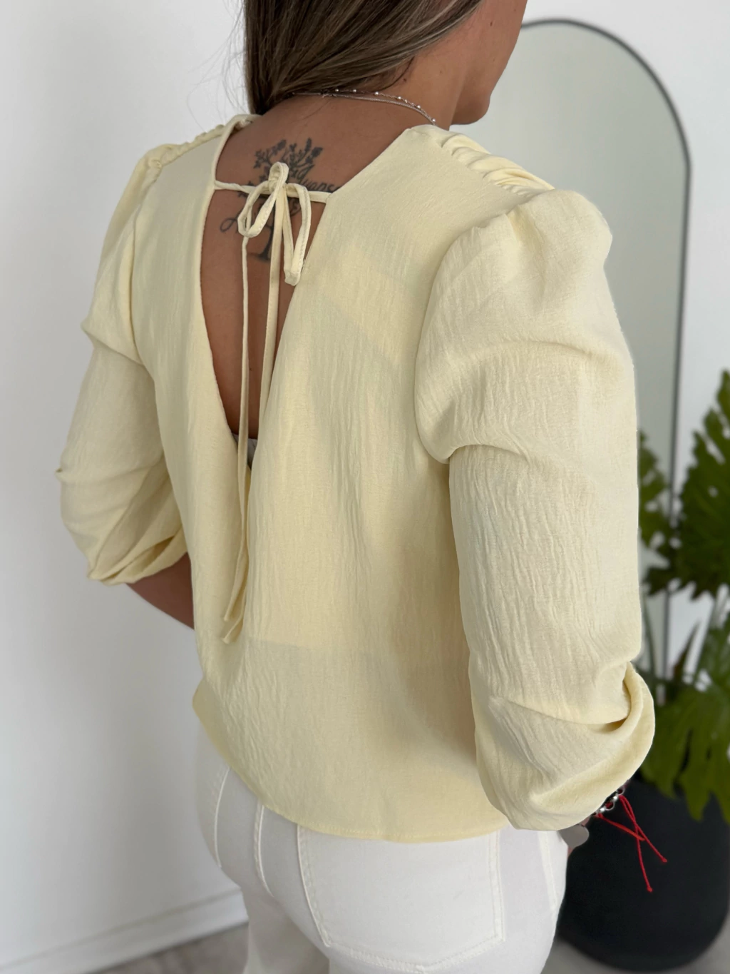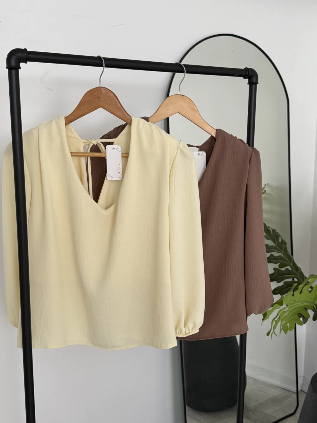 ✨ Esta blusa en tonos chocolate y amarillo combina hombreritas con un escote en V súper favorecedor. Perfecta para esas ocasiones en las que querés destacar sin esfuerzo.