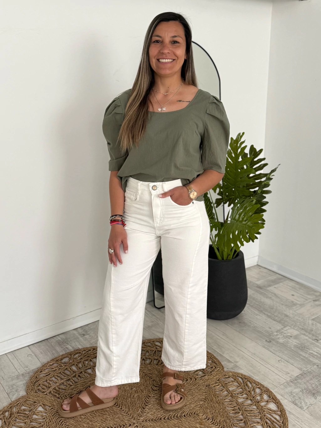 Confeccionada en algodón viscosa, una tela suave y fresca con caída natural. La Blusa Santorini tiene mangas 3/4 estilo princesa y un calce amplio que aporta comodidad y un toque romántico.