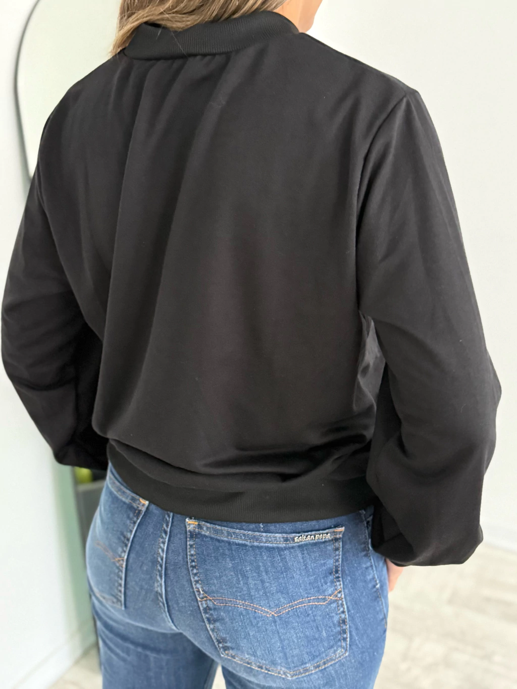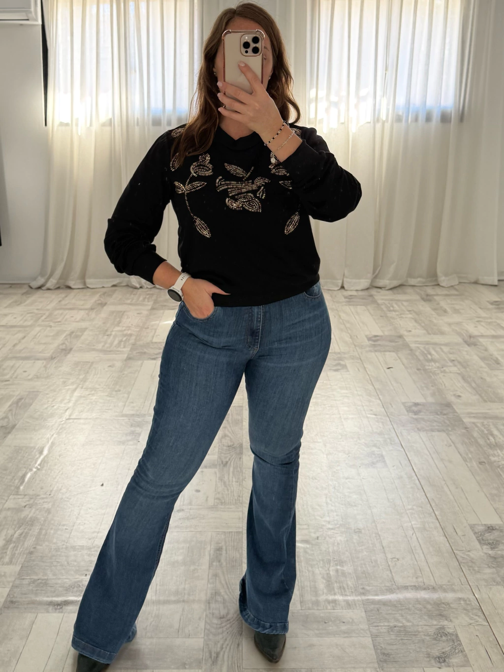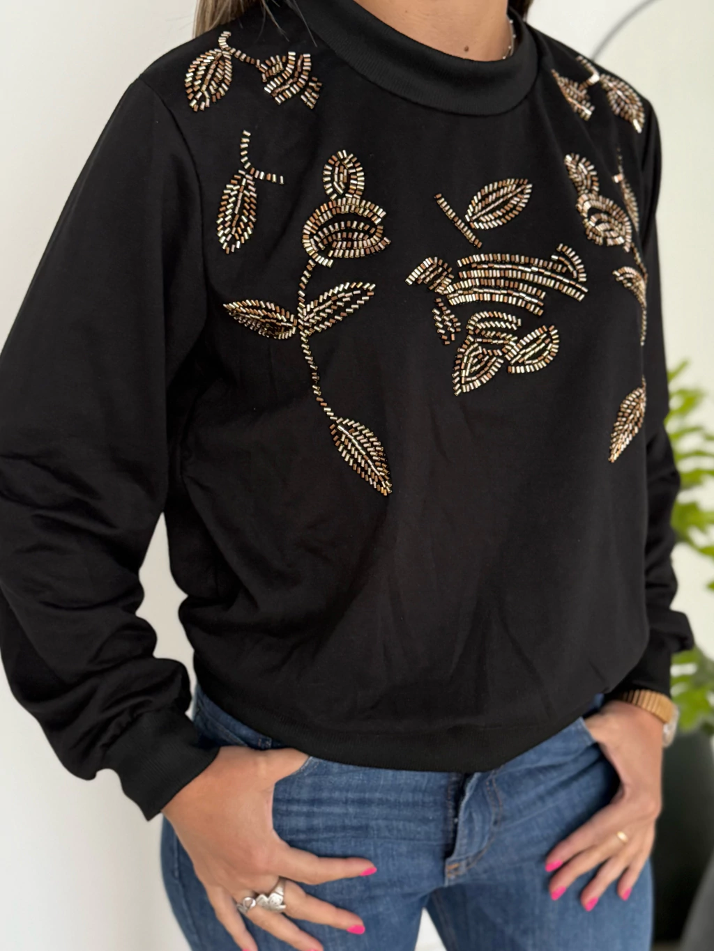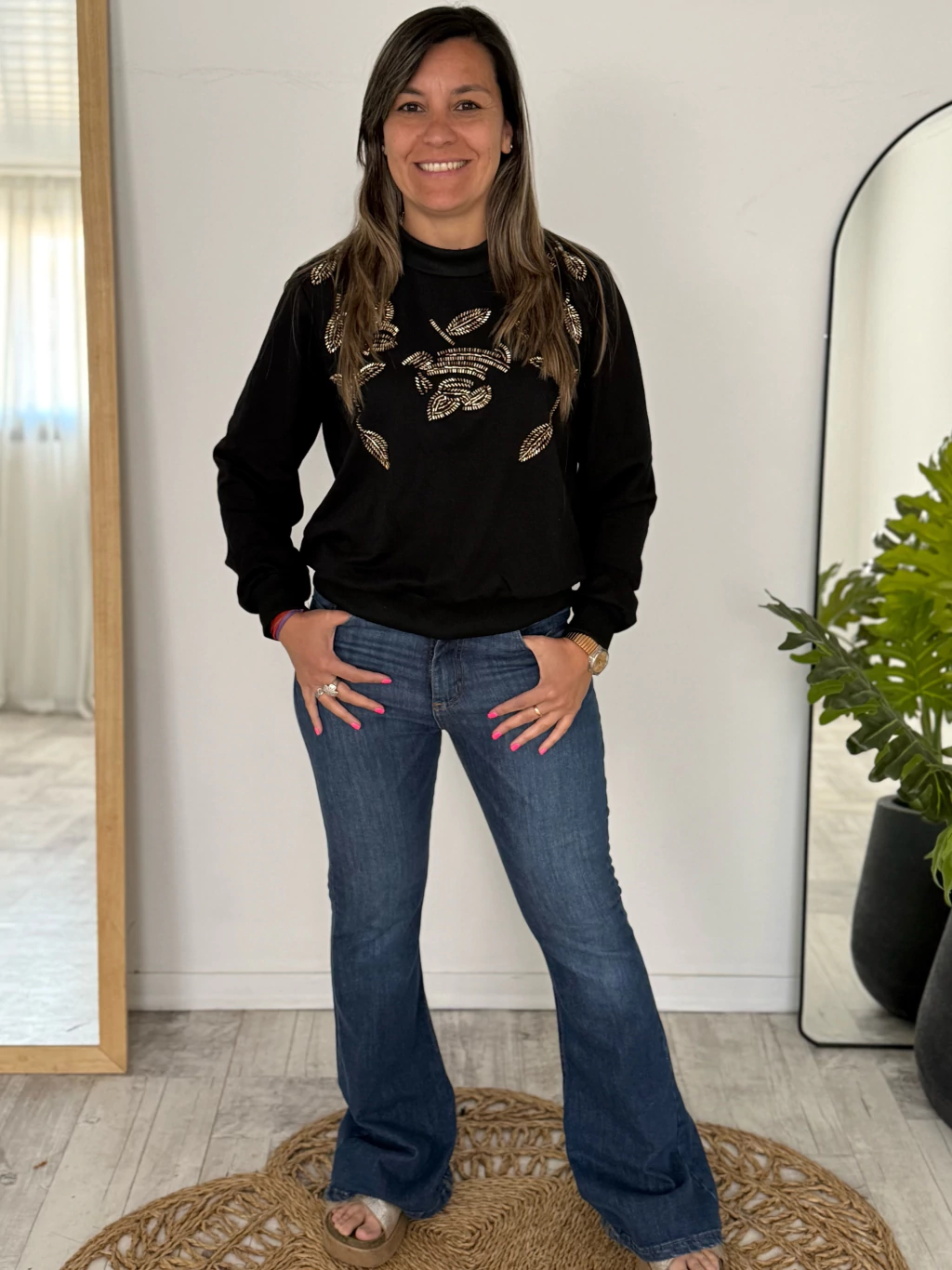 Buzo negro con apliques bordados. Cómodo, versátil y con detalles únicos en bordado que elevan tu look al instante. Ideal para combinar con jeans o joggers. 🌿