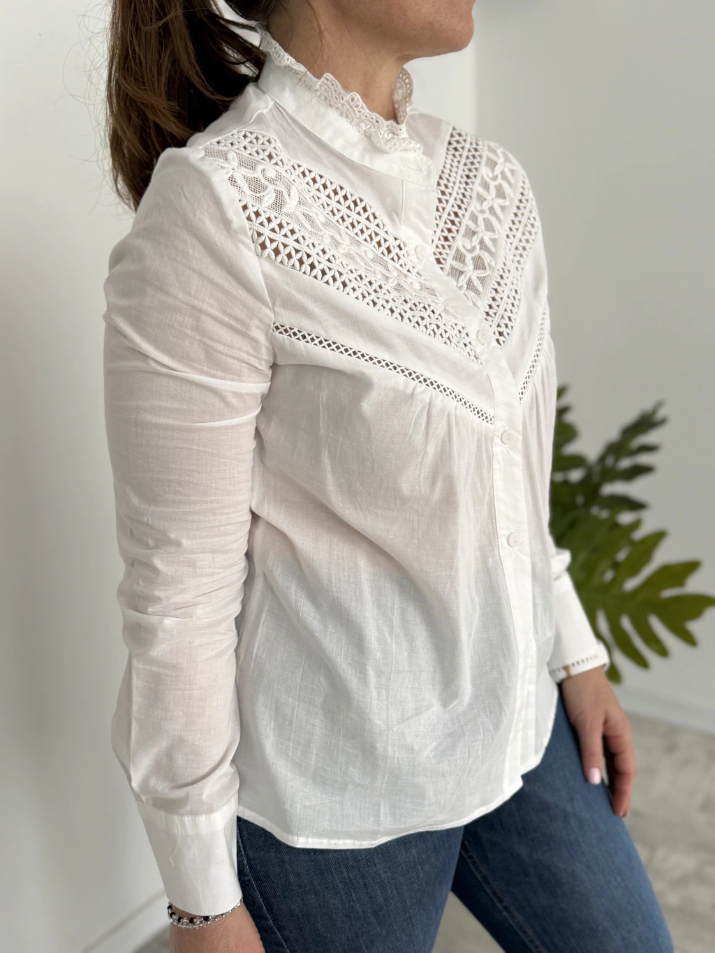 Blusa blanca con detalles calados y encaje en el frente, de estilo romántico y delicado. Su cuello con volado y los acabados en broderie le dan un aire femenino y sofisticado, ideal para elevar cualquier look casual o elegante. 🌸✨