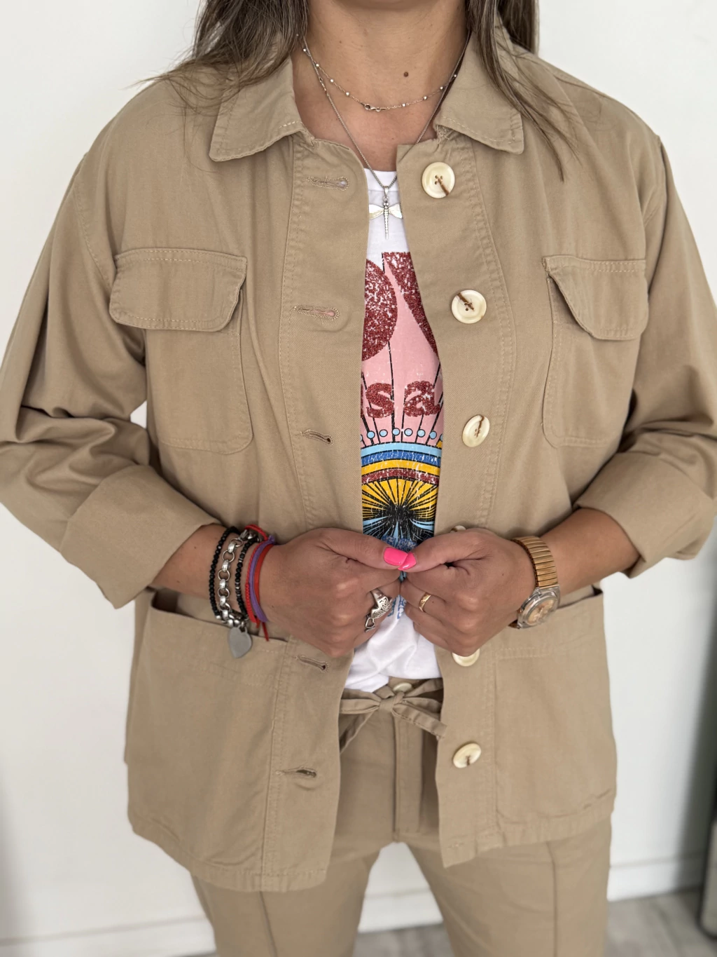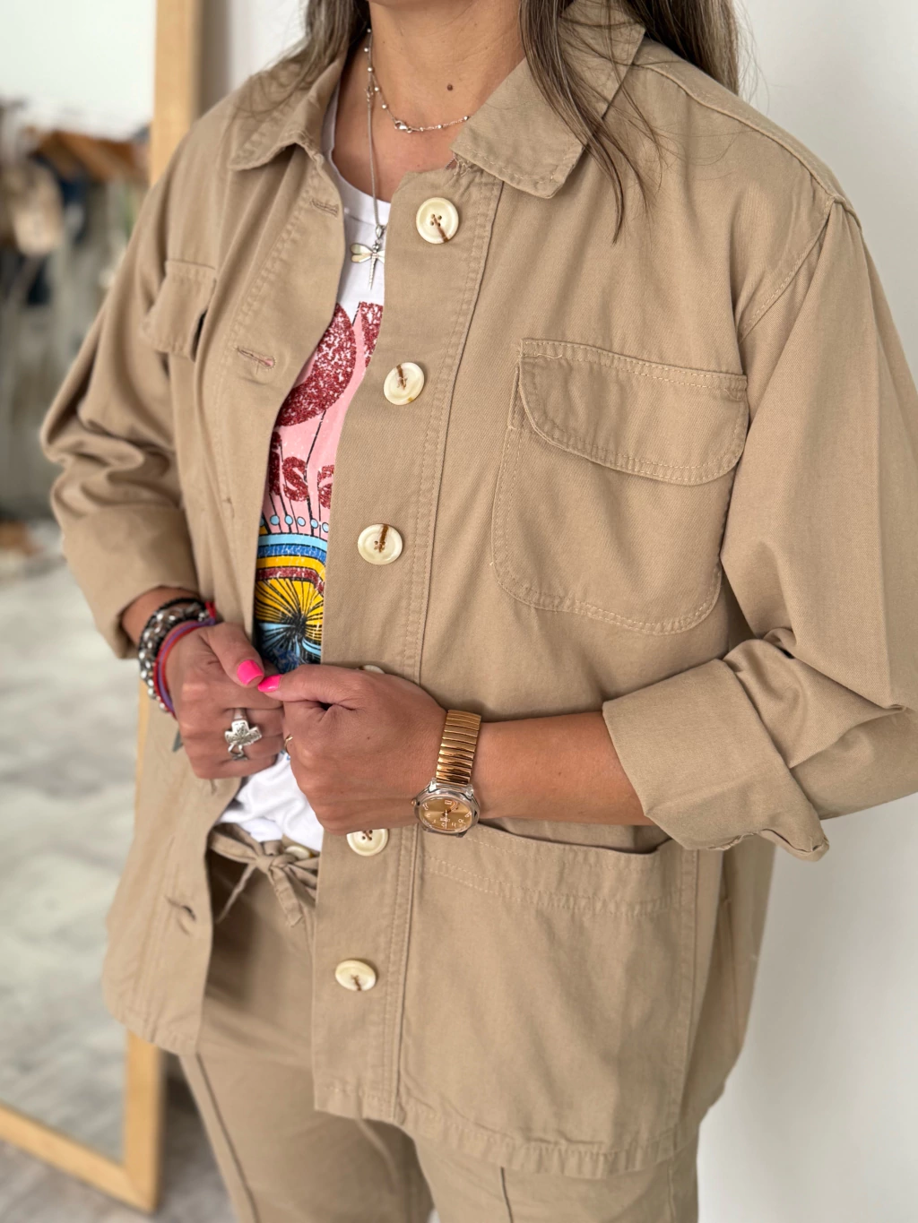 Chaqueta Lucrecia beige, corte clásico con bolsillos frontales y botones grandes. De gabardina súper liviana. De diseño relajado y urbano, es perfecta para usar abierta como sobrecamisa o cerrada para un look más casual y canchero. 💚✨