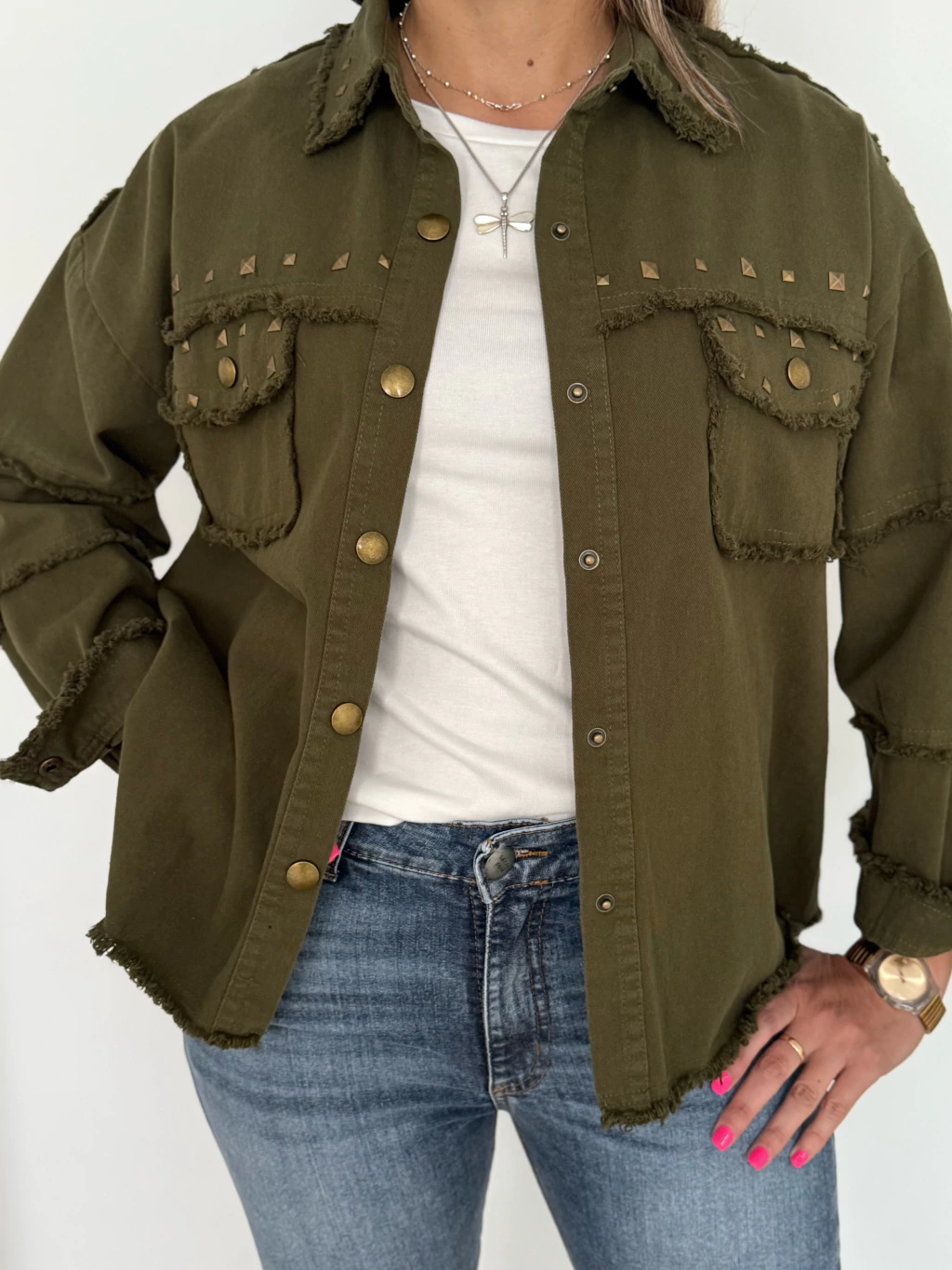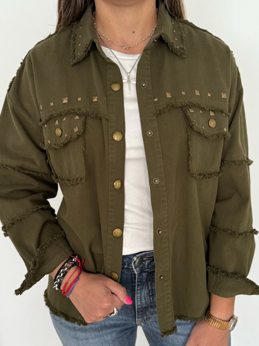 La chaqueta Rapsodia está confeccionada en gabardina verde militar (sin forreria) un material resistente y con caída ideal para todo el año. Tiene bolsillos frontales con detalle de tachas y botones metálicos que le dan un estilo urbano y actual. Disponible en 4 talles (del S al XL) es una prenda versátil y cómoda que se adapta a distintos looks: combinala con jeans, pantalones o vestidos para darle a tu outfit un toque único.