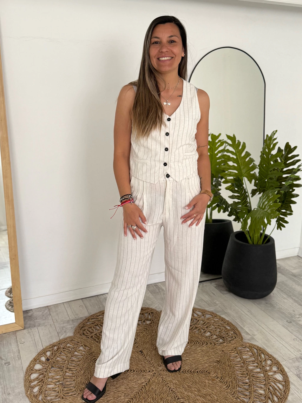 El Madness está confeccionado en lino rayado, un tejido liviano y respirable que aporta un toque natural y elegante. Su corte canchero y relajado lo convierte en la opción ideal para acompañarte en tus días de verano o salidas casuales con estilo.