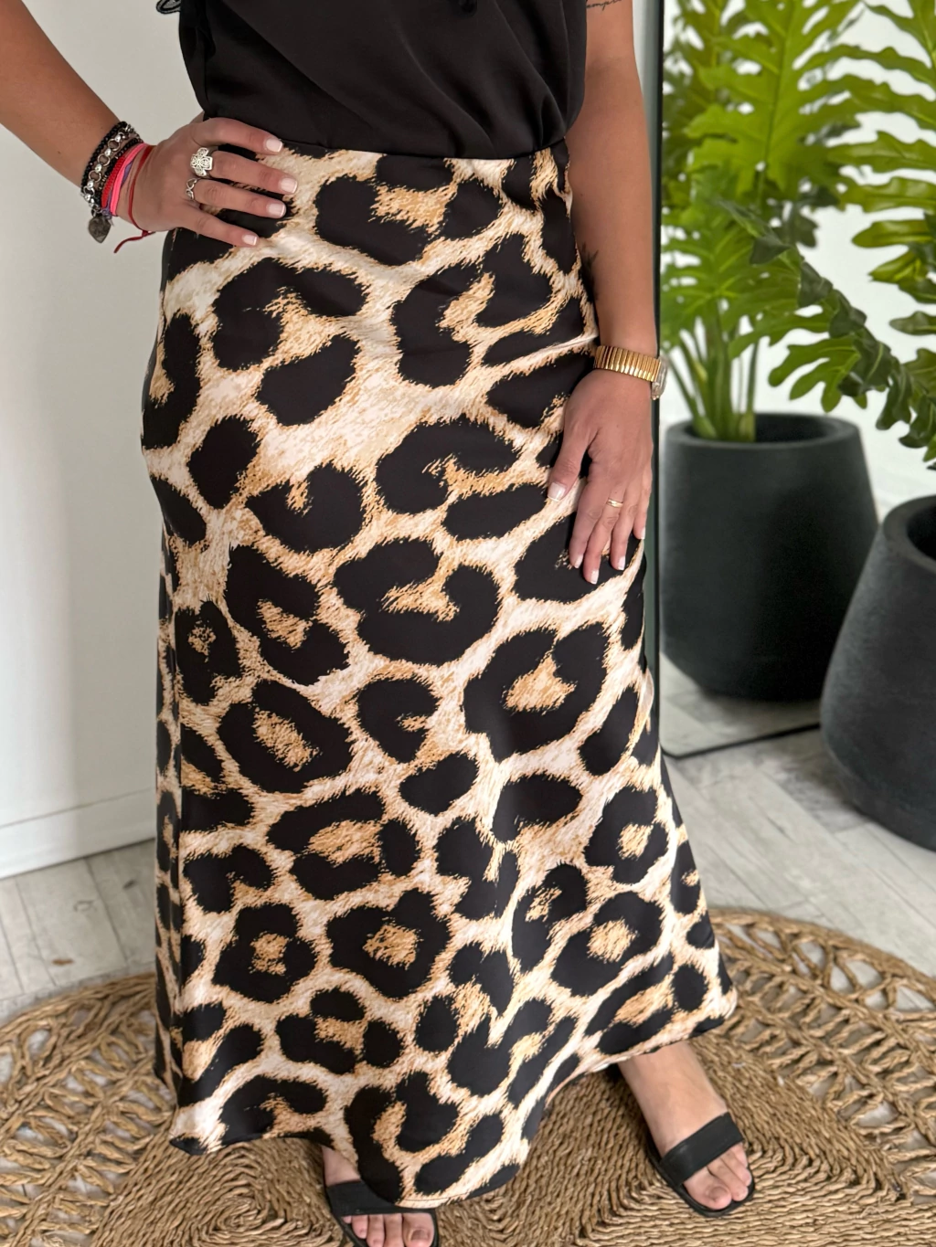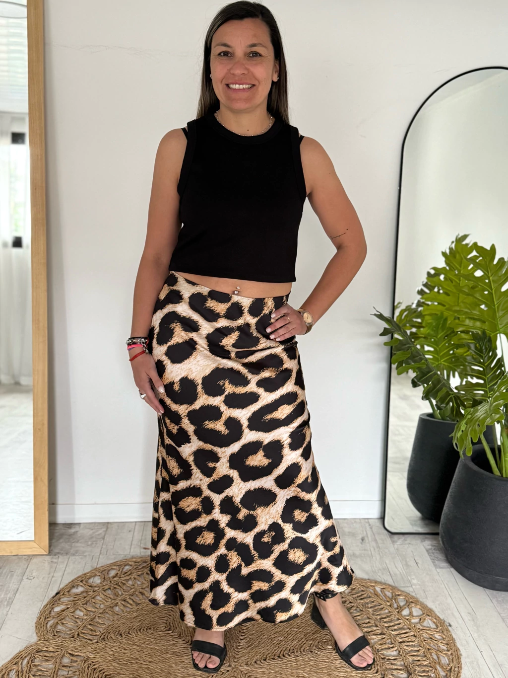Confeccionada en satén con un toque de spandex, esta pollera ofrece una caída fluida y cómoda, adaptándose perfectamente gracias a su cintura con elástico. Su estampa print la convierte en una opción moderna y versátil, ideal para usar tanto de día como de noche.