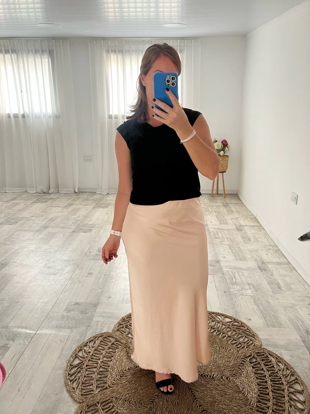 Confeccionada en satén con un toque de spandex, esta pollera ofrece una caída fluida y cómoda, adaptándose perfectamente gracias a su cintura con elástico.
