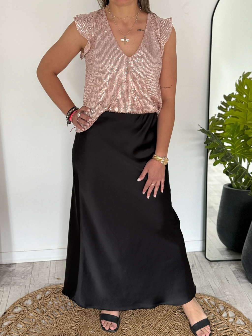 Confeccionada en satén con un toque de spandex, esta pollera ofrece una caída fluida y cómoda, adaptándose perfectamente gracias a su cintura con elástico.