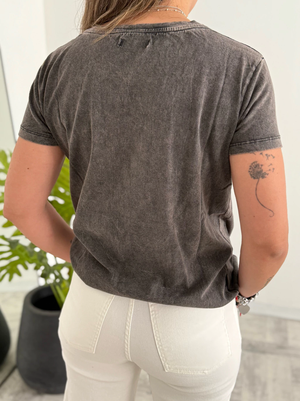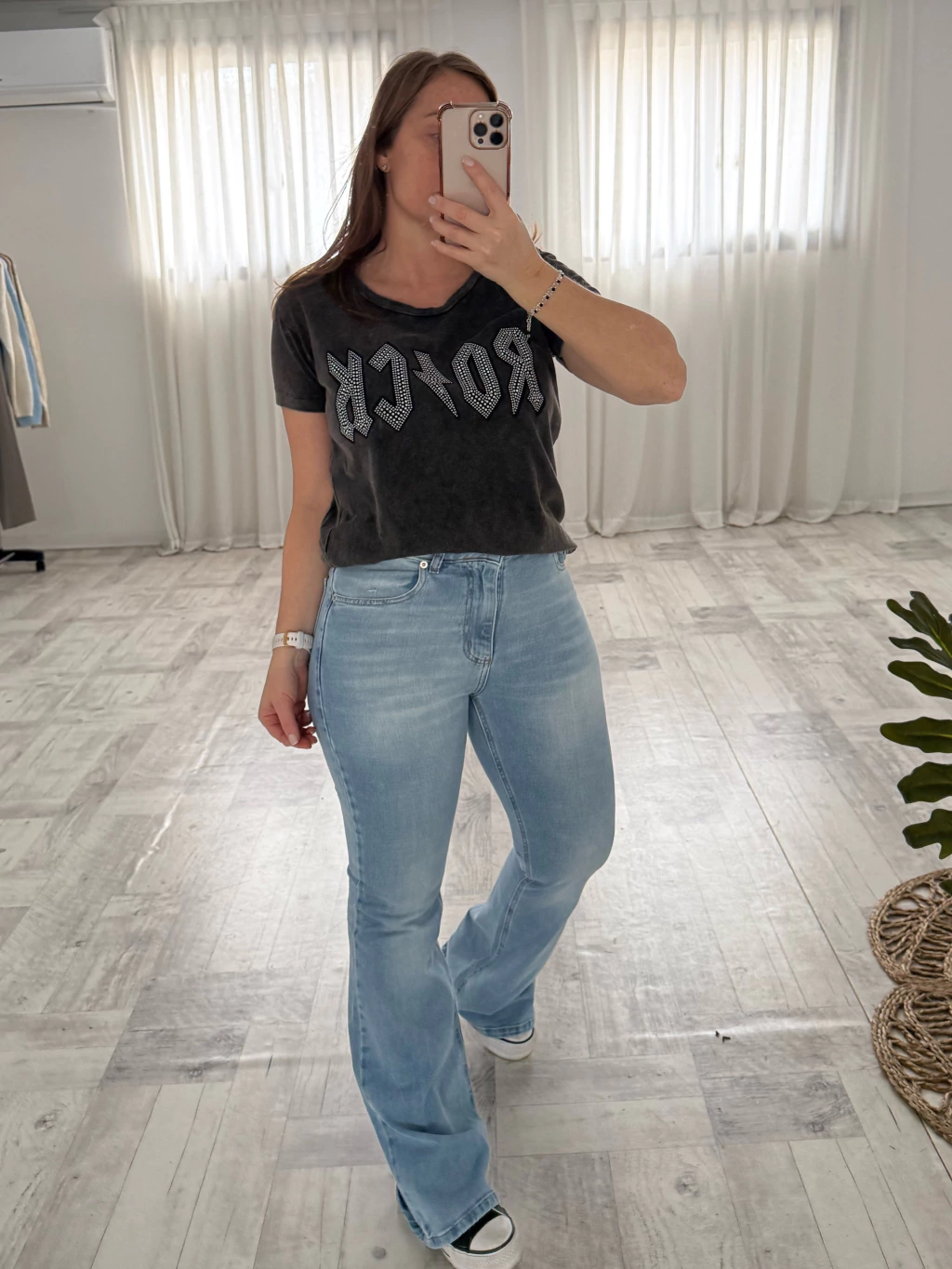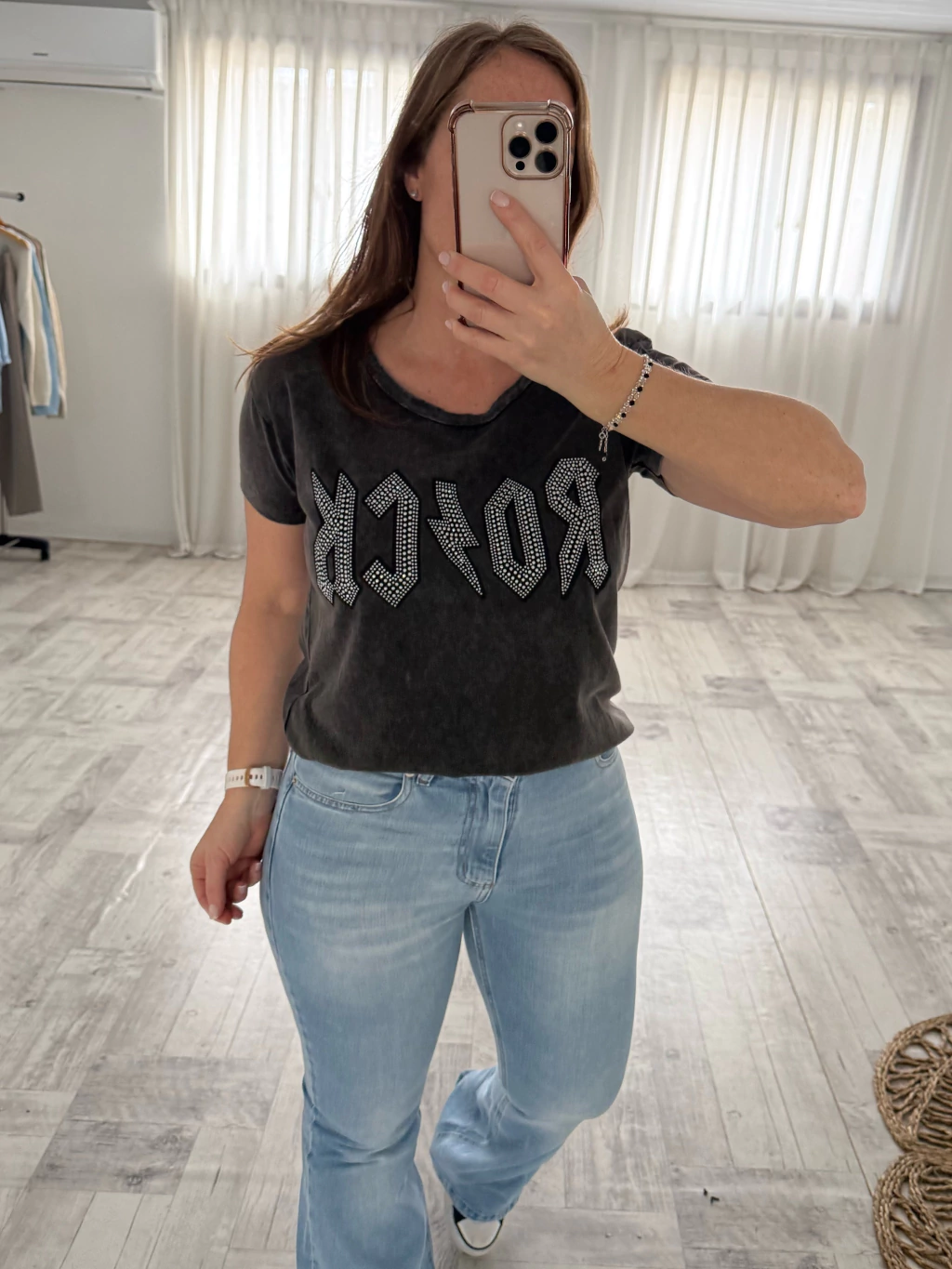 Remera manga corta que eleva tu estilo con un toque audaz. Su escote redondo y confección enjersey prelavado brindan máxima suavidad y confort. Destácate con su exclusiva estampa y apliques de strass color tornasolado, ideales para sumar brillo a cualquier look.