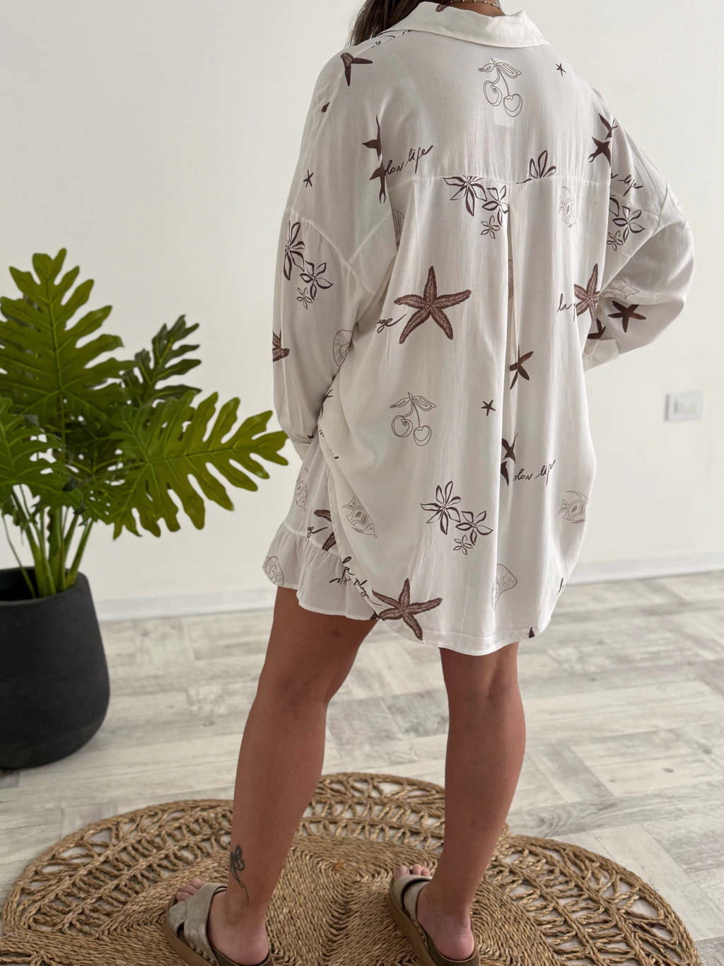 Set de camisa y short estampado con motivos marinos, caracoles y estrellas en tonos chocolate sobre fondo blanco.