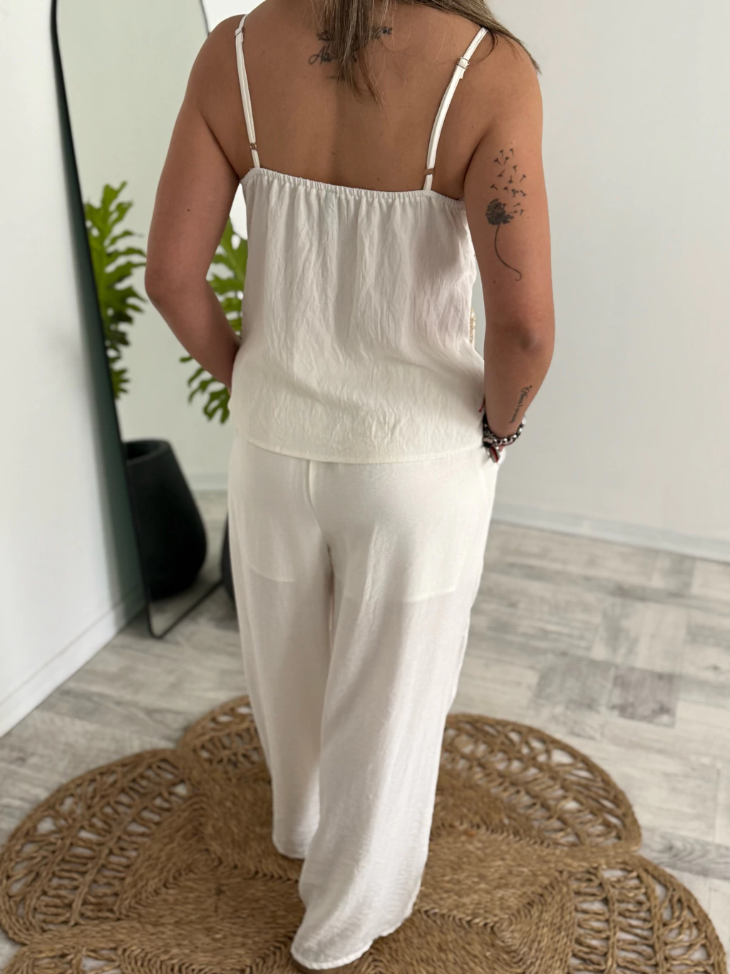 * Top Carola: Con breteles finos, botones frontales y el bordado que enmarca el pecho.