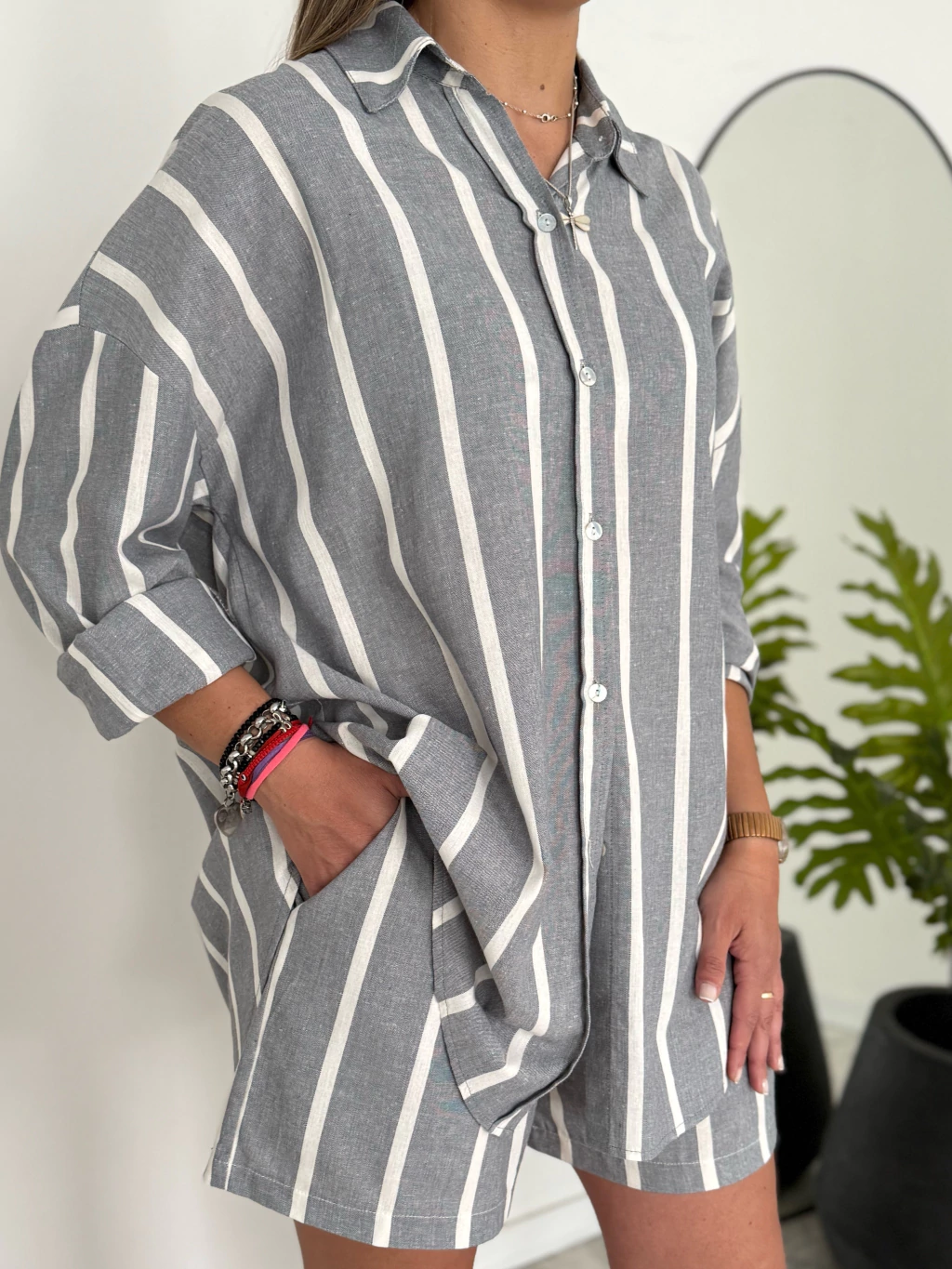 Set de camisa y short con rayas verticales en tono gris y blanco.