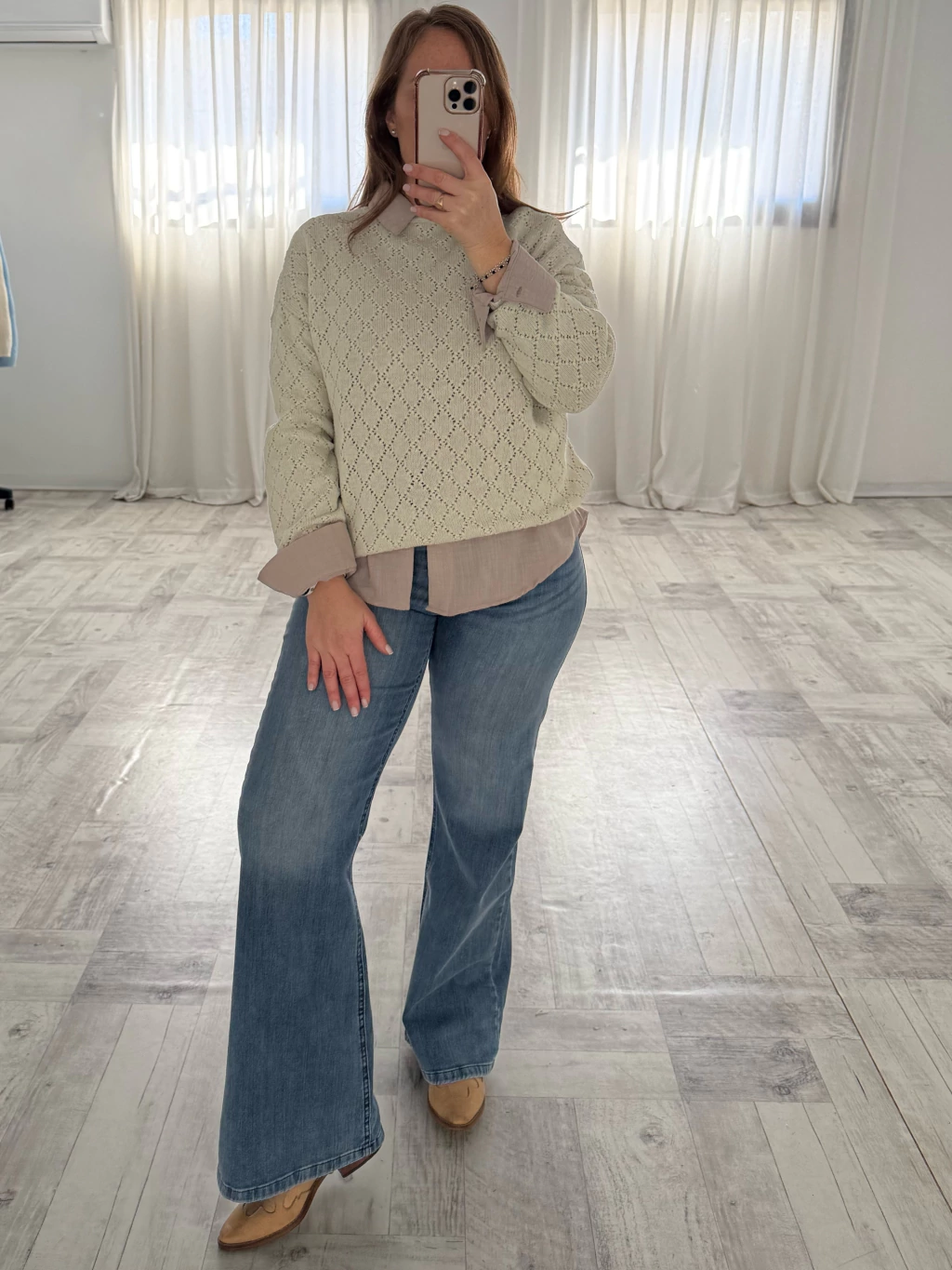 El sweater es un modelo tejido en punto calado con diseño de rombos pequeños. Tiene un estilo clásico y delicado, ideal para looks casuales o elegantes.