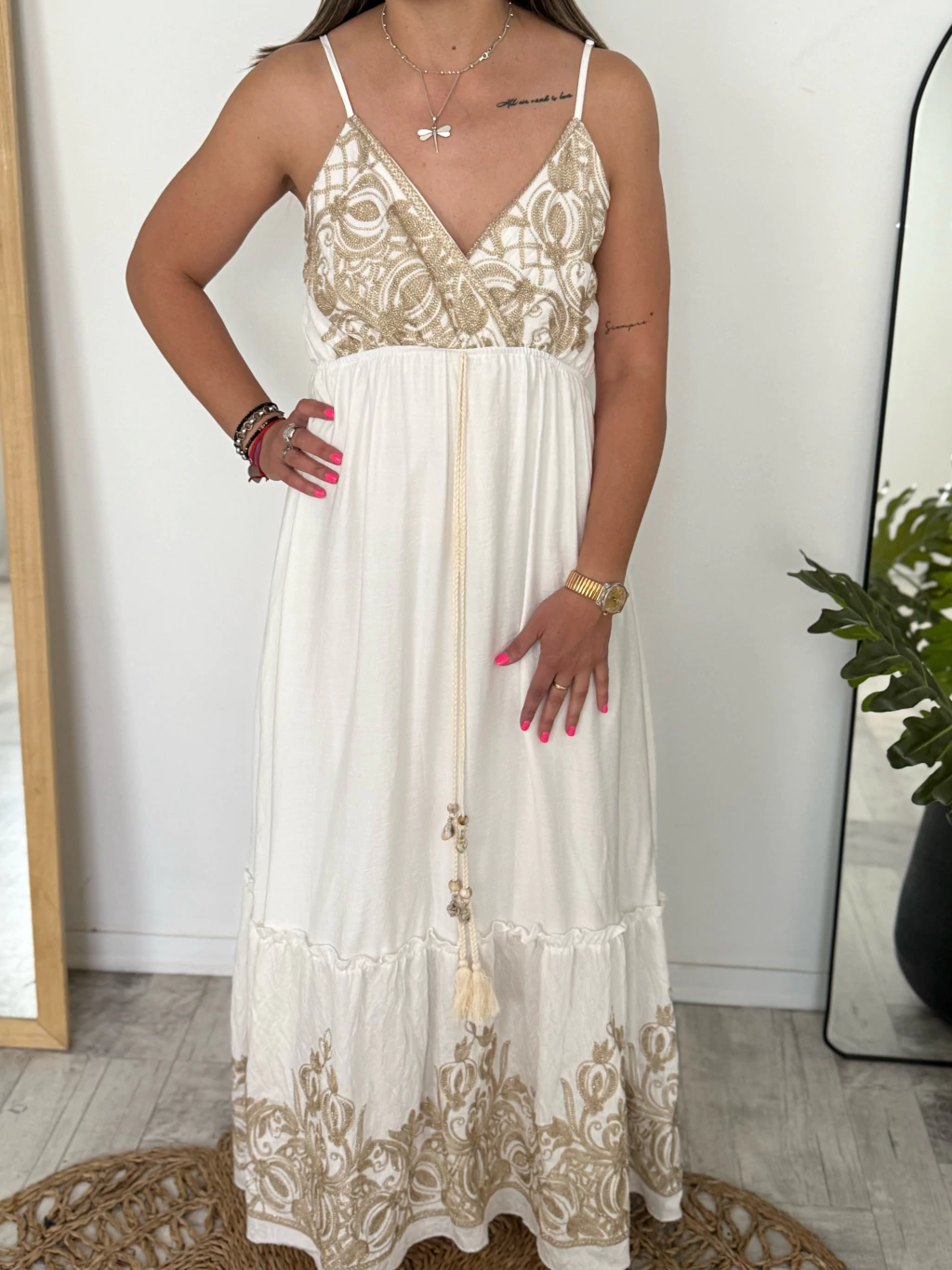 Su diseño es ultra favorecedor: escote en V con breteles finos, un delicado ajuste debajo del busto con cordón, y una caída fluida que te da un movimiento espectacular.