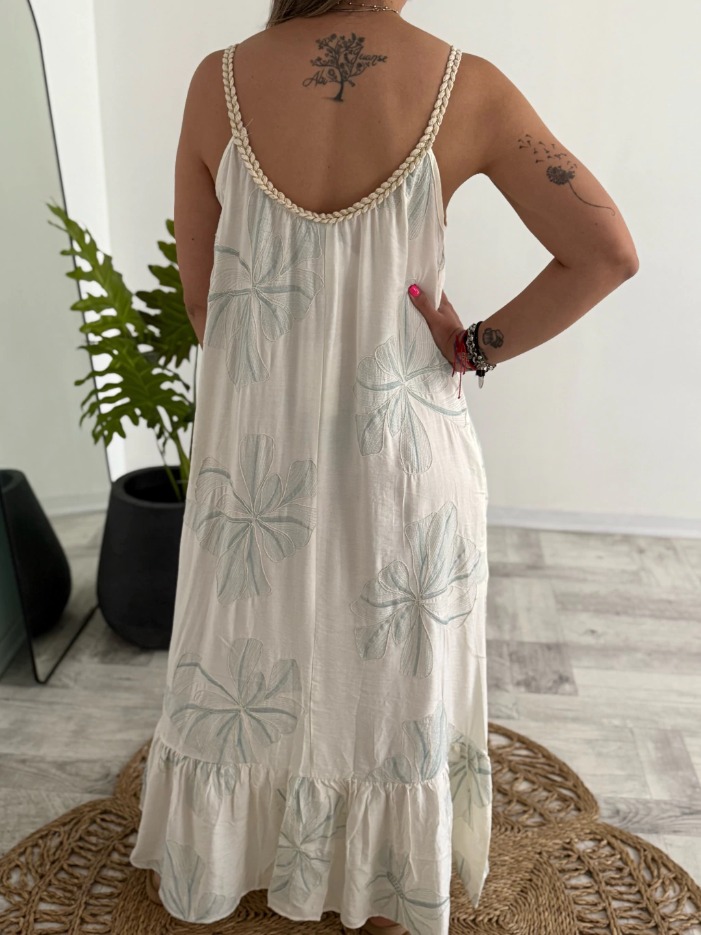 El vestido es de color crema (un blanco cálido) con estampa floral en tono verde agua/verde pastel muy suave.
